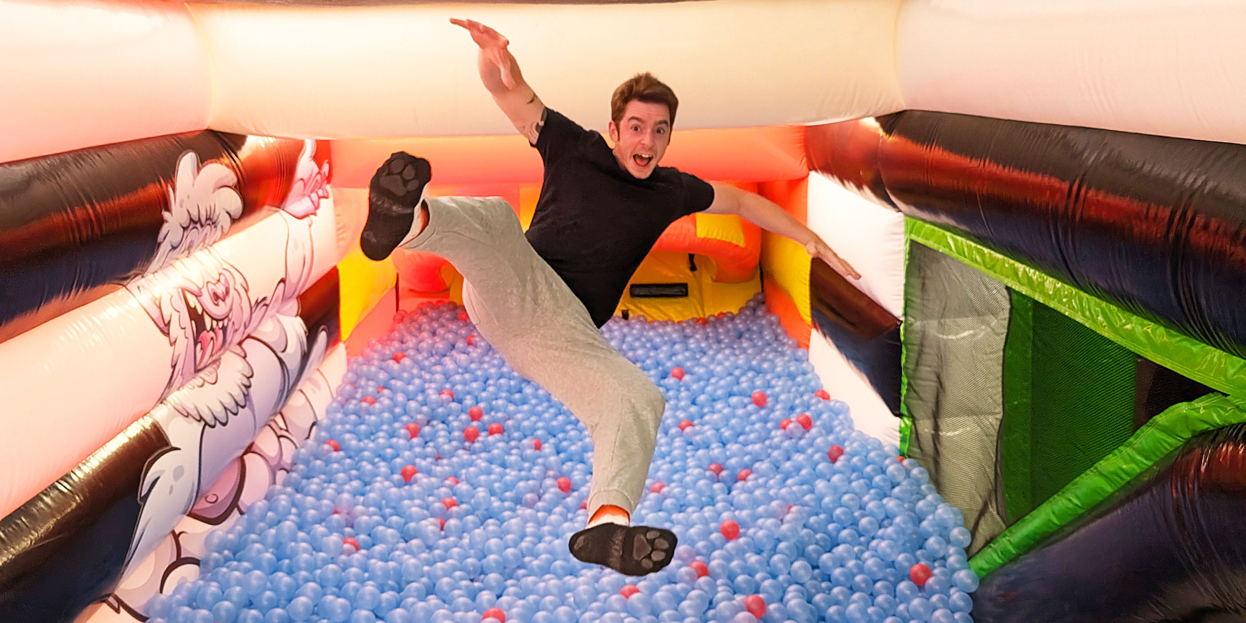 So groß wie über 60 Hüpfburgen zusammen, aber mit mehr Abwechslung! Mit 17 coolen Bereichen: zwei Riesen-Bällebäder, Wipe Out, Rutschen, Vulkan, Sprungbälle, Säulenwald uvm.